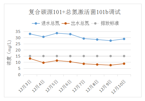 技術方案:在不改變水站原有設施的條件下,采用生化系統菌群優化及針對性營養素組合的方案,使用我司復合碳源101b與總氮激活菌101,將系統出水總氮穩定降至15 mg/L以下。